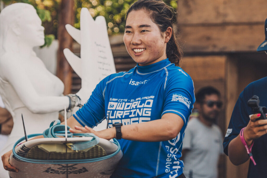 虹帆選手は1本目で 4.00 をスコア。さらにパドルバック中に掴んだ波で 6.93 を獲得し、そのリードを守り切りました。
