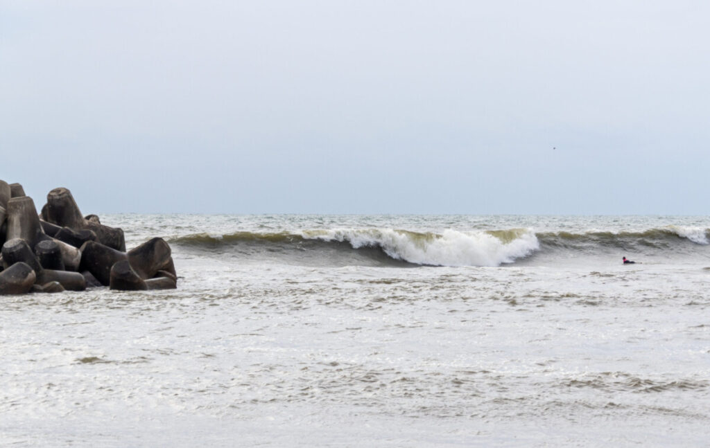 夜明け直後に干潮を迎え、その後ゆっくりと上げに転じる潮回り。強いサイドオンショアが吹き付け、海面は乱れ、波はコシ~ハラサイズながら流れも伴う。アウトからインサイドまで、どこで勝負するか。その判断と技術が明暗を分ける状況となった。