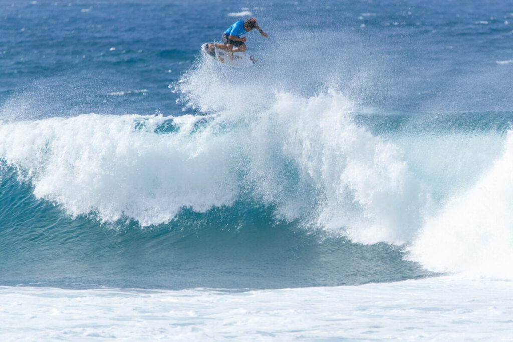 残り10分を切った場面でパイプのセットを捉え、クローズ気味のセクションをこじ開け、フィニッシュでフィンアウトしながらのリエントリーを決めて7.50をスコア。これがヒートの流れを一変させ、トップへ浮上。そのままリードを守り切り、1位で勝ち上がった。
